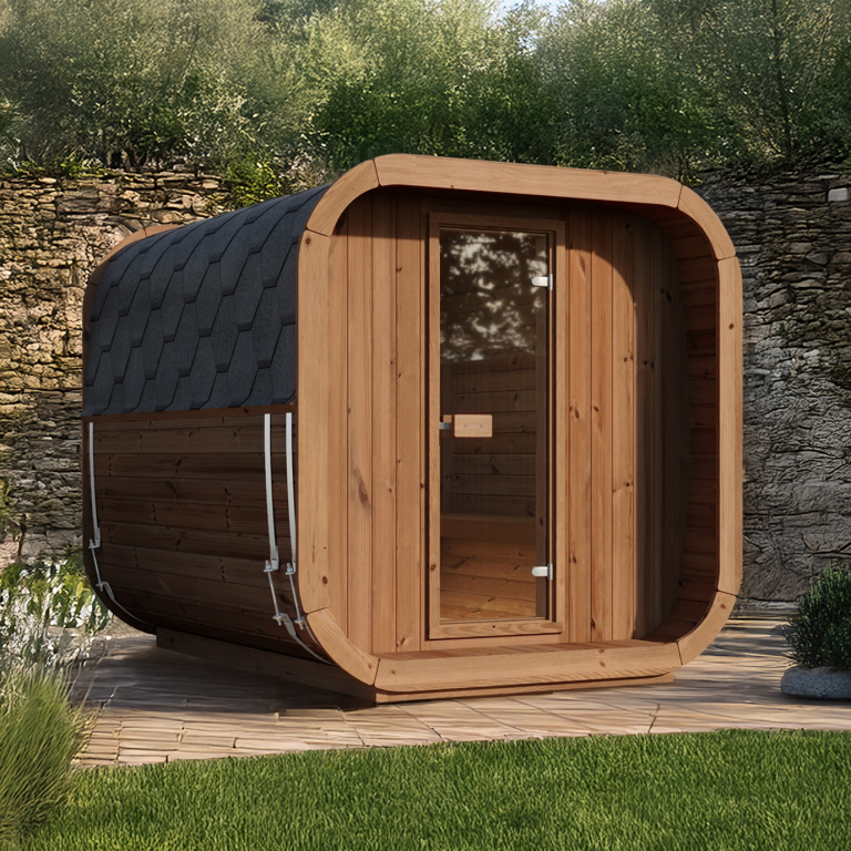 Sa stabilité dimensionnelle remarquable signifie que le bois ne subit pratiquement plus de retrait ni de gonflement au fil des saisons : fini les déformations liées à l'humidité, les portes qui coincent ou les joints qui s'ouvrent. Sa durabilité naturelle lui confère une résistance exceptionnelle aux intempéries, aux champignons et aux parasites — sans entretien chimique ni traitement régulier. Et sa teinte sombre et chaleureuse espresso confère au sauna un aspect luxueux et résolument contemporain qui sublime n'importe quel environnement paysager. Aucun traitement préalable n'est nécessaire avant le montage.