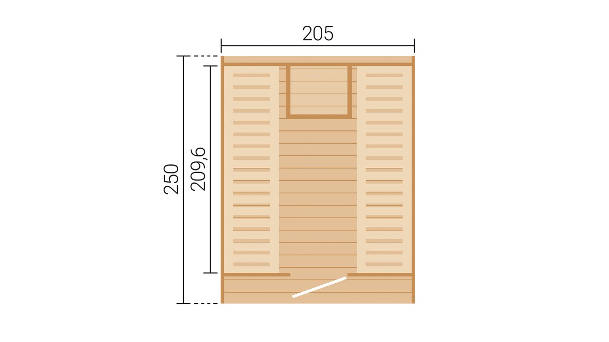 - Dimensions extérieures hors-tout (avec avancée de toit) : 205 × 250 cm