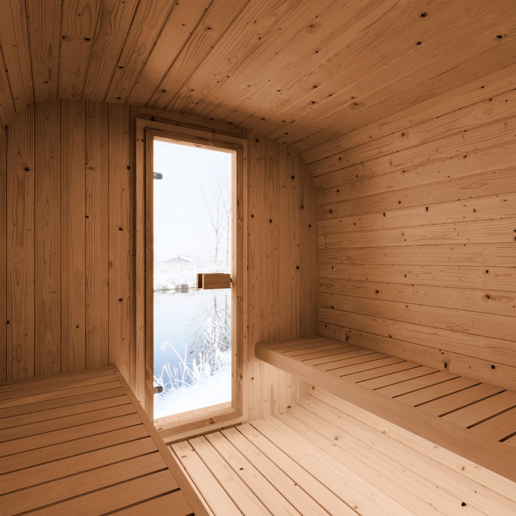 À l'intérieur, le LAADI 3 est équipé de deux banquettes de 193 cm en bois de tremble thermotraité — l'essence reine pour le sauna. Le secret du tremble réside dans sa très faible conductivité thermique : même lorsque le poêle est à pleine puissance et que la température atteint 90°C, le bois des banquettes reste doux et agréablement chaud au toucher, jamais brûlant. Vous pouvez vous installer confortablement et profiter pleinement de chaque séance, sans contrainte ni inconfort.