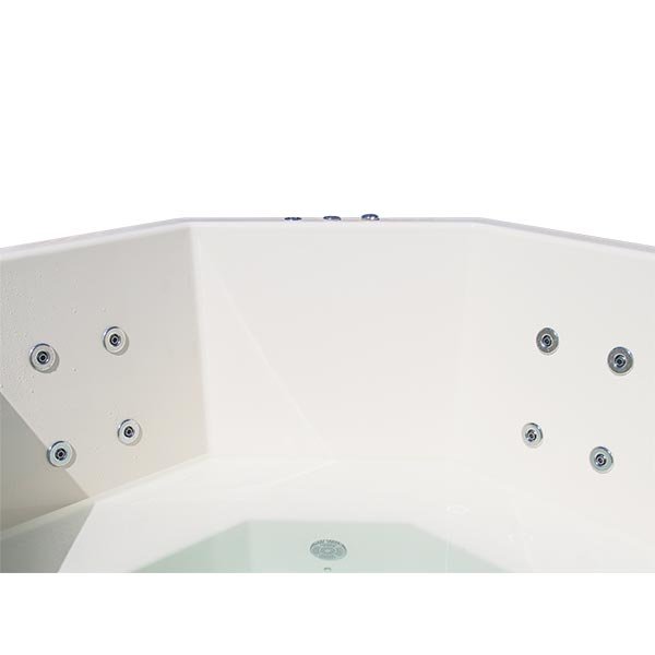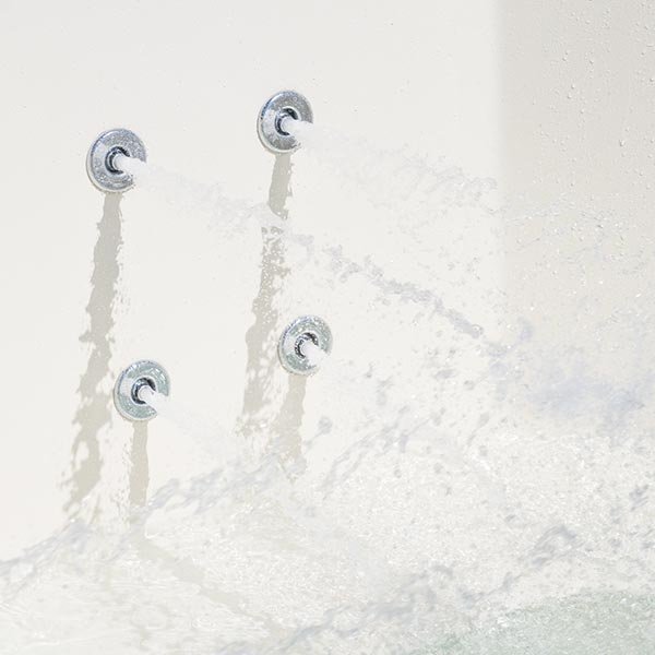 Le système d'hydromassage HDR8 fonctionne grâce à un compresseur de 750 W qui propulse l'eau sous pression à travers 8 têtes de massage disposées sur deux parois opposées du bassin — 4 buses par paroi au niveau du dos. Cette disposition permet un massage simultané de deux baigneurs, chacun bénéficiant d'un jet puissant et ciblé sur les lombaires et le dos.